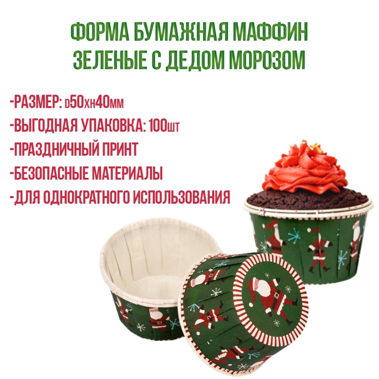 Форма бумажная Маффин Зеленые с дедом морозом (d50хh40мм), 100 шт