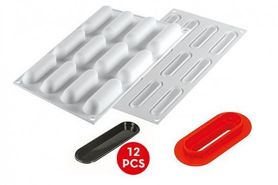 Набор состоит из силиконовой формы из 12 ячеек размером 80х22 мм, высотой 22 мм, объемом 12х30 мл, общий объем 360 мл, двойной вырубки из пластика и 12 пластиковых подносов размером 42х102 мм.Состав: Силикон+пластик