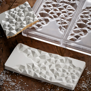 Форма поликарбонатная для приготовления шоколадных плиток размером 275х175 мм из 3 ячеек, размером 155х77 мм, высотой 10 мм. Вес готового изделия - 100 г.Состав: PC поликарбонат