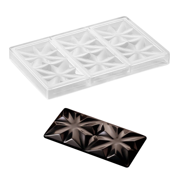 Форма поликарбонатная для приготовления шоколадных плиток размером 275х175мм из 3 ячеек, размером 155х77мм, высотой 10мм. Вес готового изделия - 100г.Состав: PC поликарбонат.