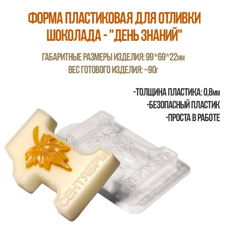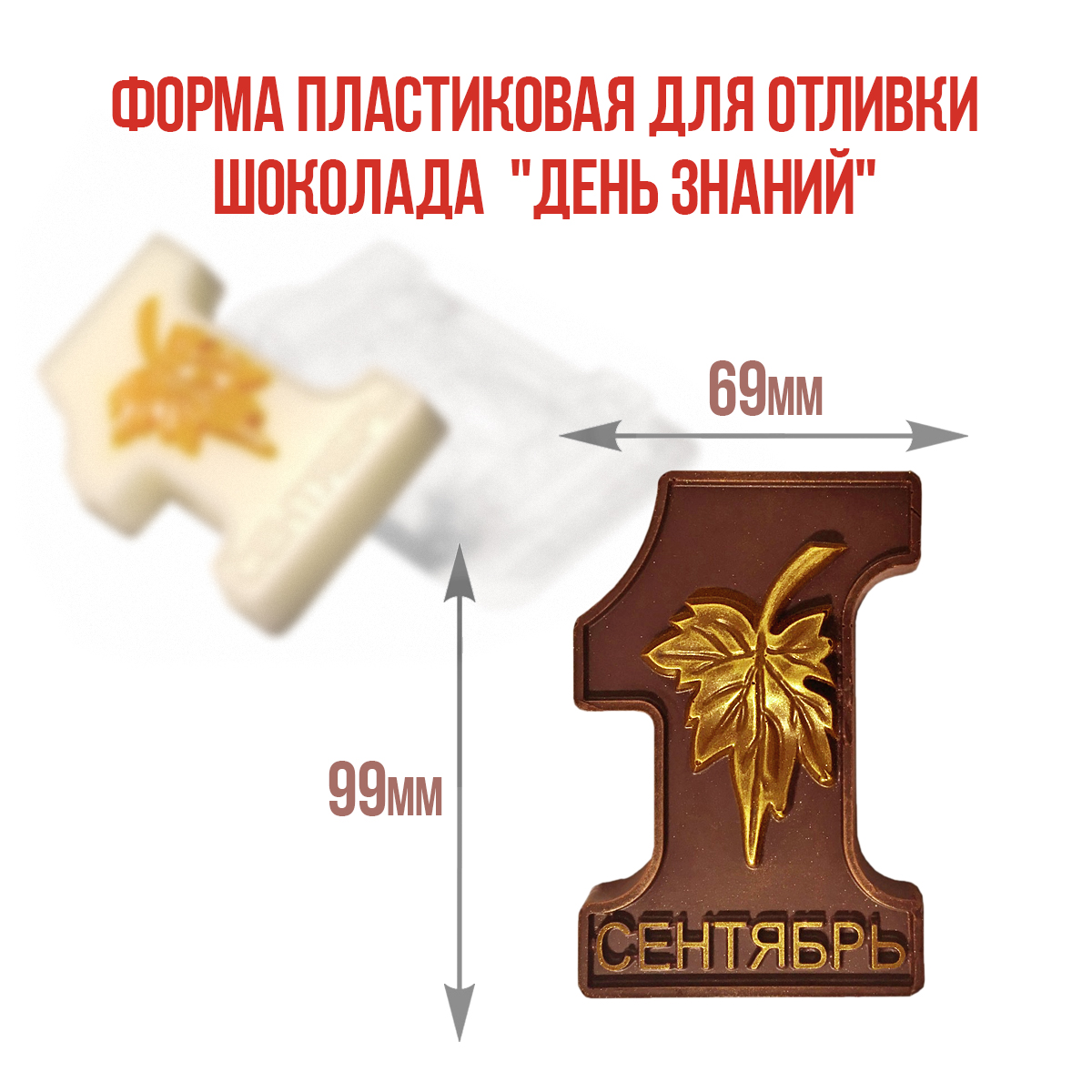 Пластиковая форма для отливки шоколадной фигурки в виде цифры 1 с осенним кленовым листом и надписью "Сентябрь".Подходит для изготовления подарочной шоколадной фигурки к 1 сентября