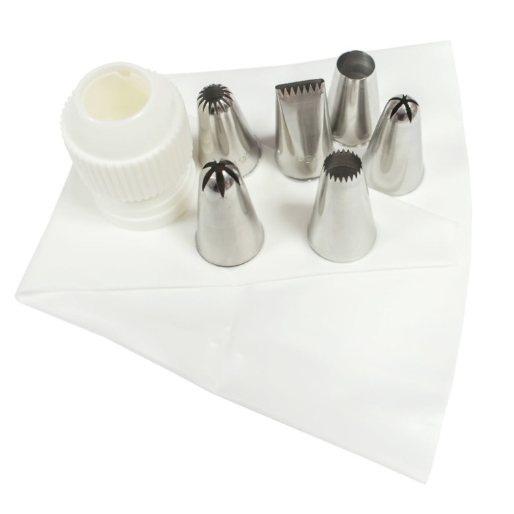 6 кондитерских насадок из нержавеющей стали, 1 кондитерский мешок (длина-25см), 1 насадка-переходник.Данный набор является прекрасным решением как для начинающего, так и для опытного кондитера. В этом наборе присутствует всё необходимое для того, чтобы приступить к украшению Ваших изделий кремами, взбитыми сливками и так далее.