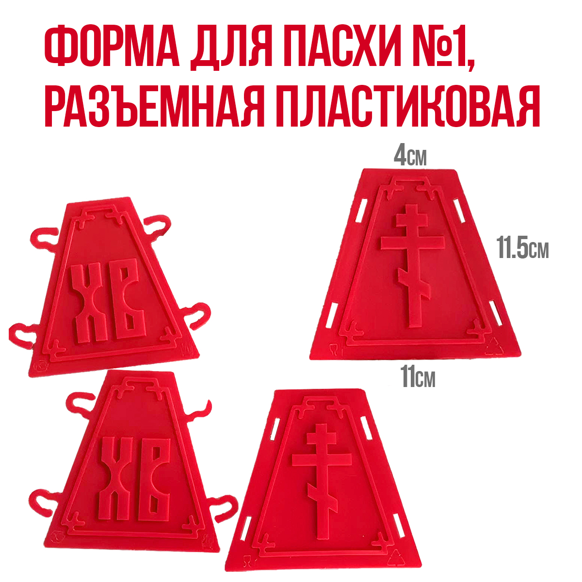Разъемная форма для творожной пасхи без дна, легко собирается.На внутренней грани выпуклый узор для украшения: православный крест и надписи ХВ.