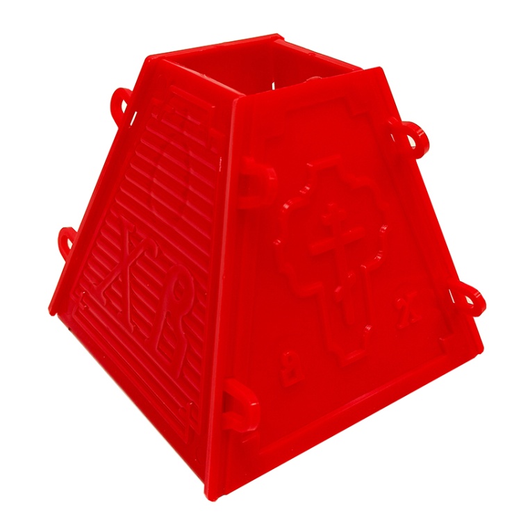 Разъемная форма для творожной пасхи без дна, легко собирается.На каждой грани выпуклый узор для украшения: православный крест и надписи ХВ.