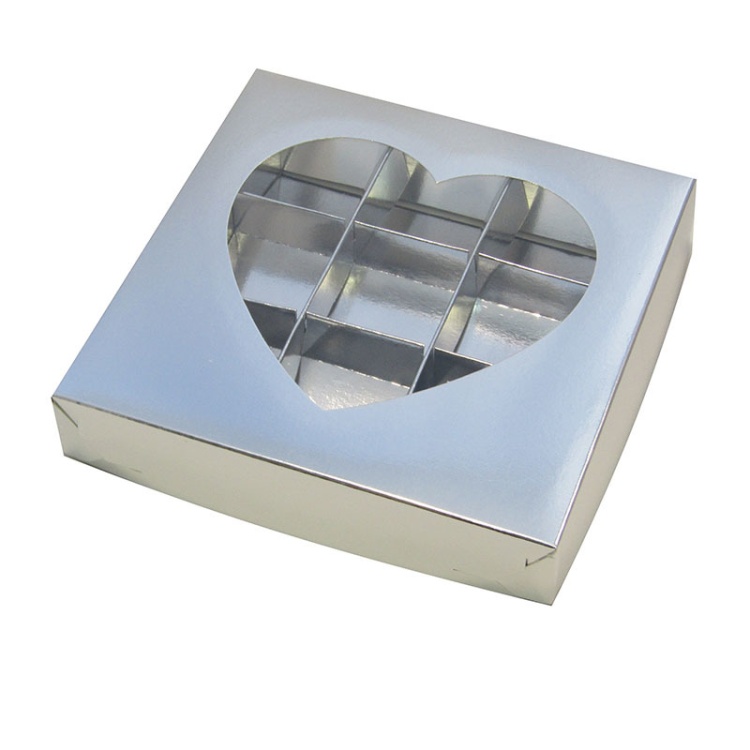 Коробка для 9 конфет с окошком сердце 160*160*30 (серебро)